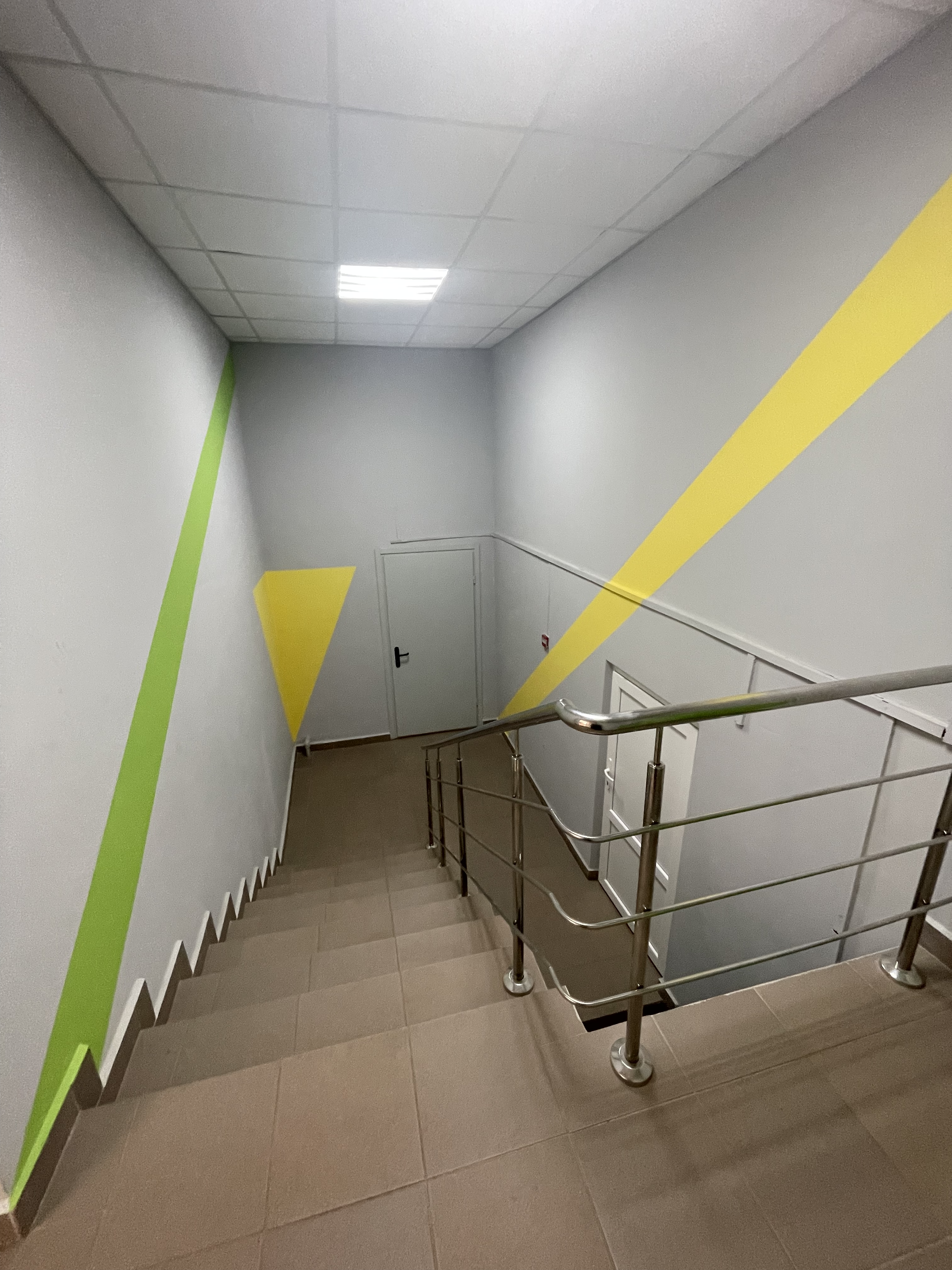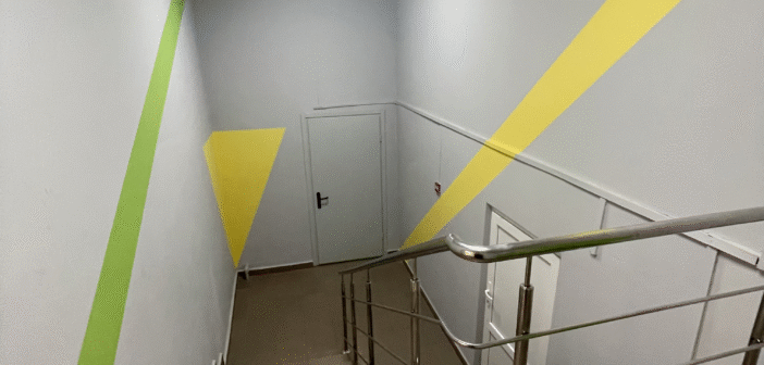 Ремонт включав монтаж стелі, облаштування підлоги, встановлення дверей, водопроводу та каналізації, електромонтажні роботи й вентиляцію. Традиційно фарбування стін підрядник виконав з додаванням жовто-зелених елементів – ліній, яких ми впізнавали скрізь у місцевості.