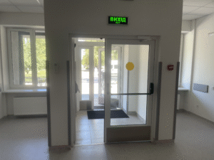 При вході облаштовано пандус із правильним кутом нахилу, широкі коридори дозволяють комфортно пересуватися людям на візках, а дверні прорізи — відповідати вимогам ДБН.