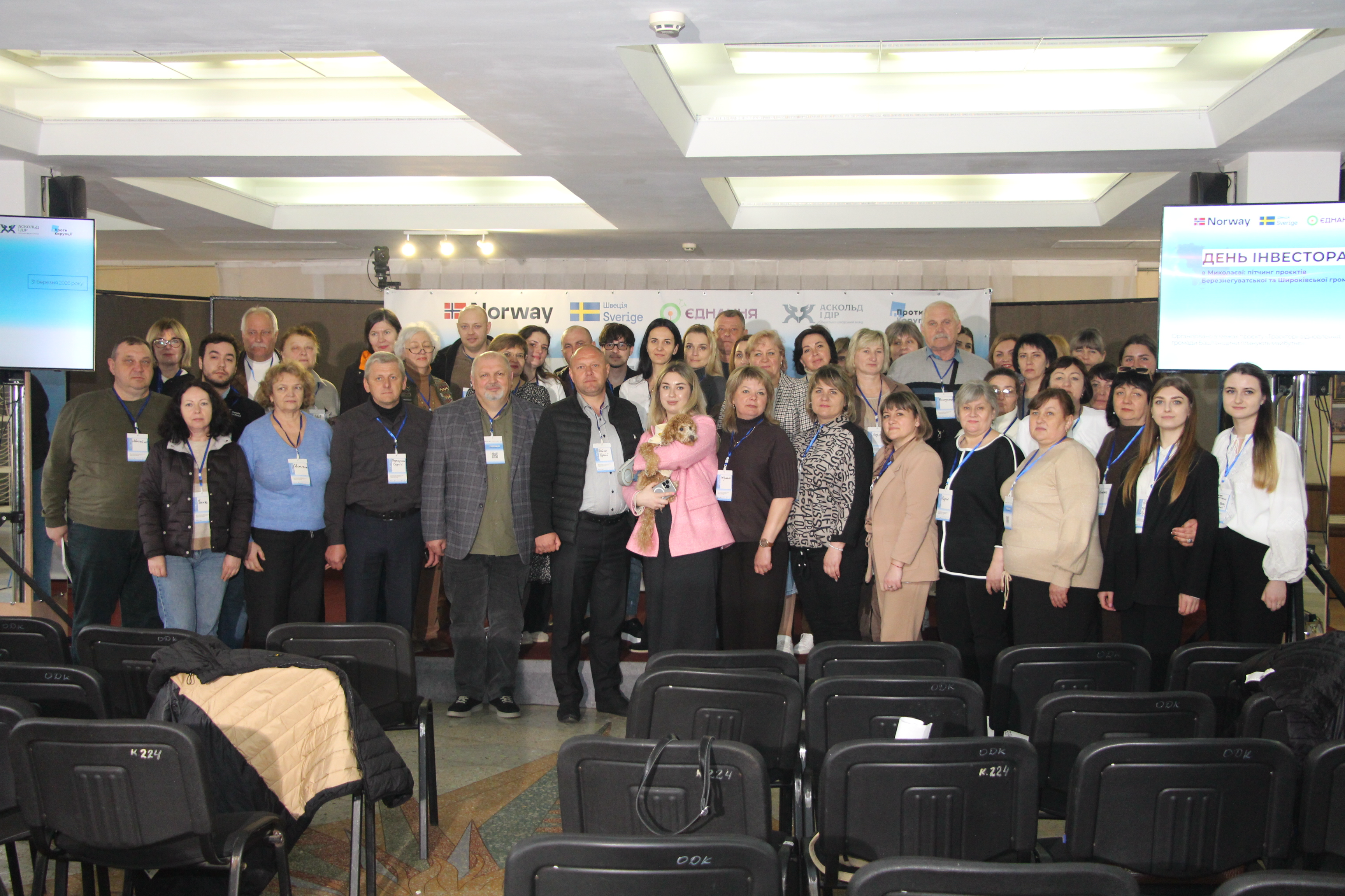 У залі Обласного палацу культури зібралися понад 70 учасників/-ць, серед яких представники/-ці органів влади, медіа, міжнародні партнери/-ки, інвестори та експертне середовище. Навіть попри кілька нічних повітряних тривог, зал був повністю заповненим. Відчувалася не просто офіційність, а зацікавленість — громади презентували проєкти, над якими працювали разом з експертами ГО «Проти Корупції»: від аналізу потенціалу до формування інвестиційних портфелів.